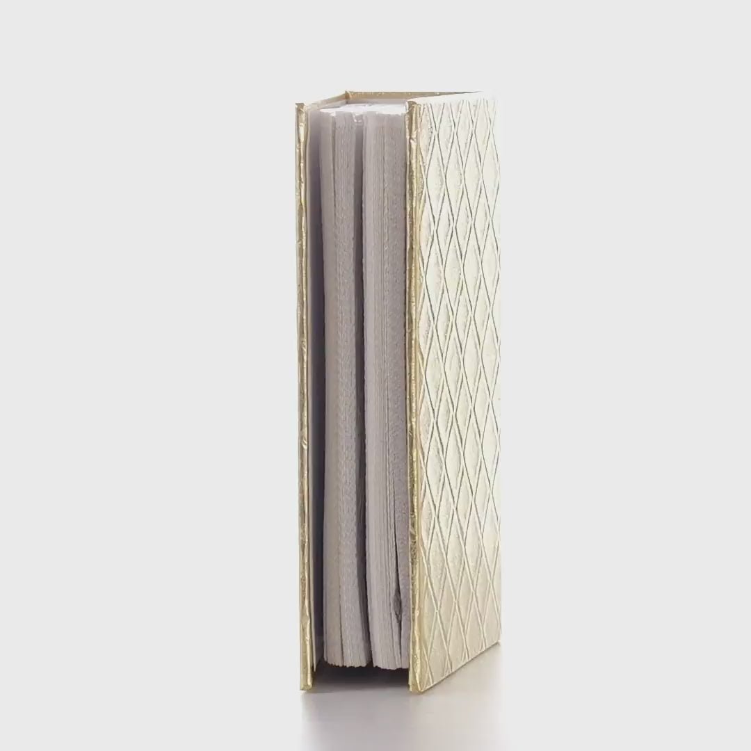 Classic photo album with embossed cover, available in gold and silver variants. Its elegant design, with raised geometric texture, makes it suitable for preserving and displaying memories in a refined manner. The album has a capacity of 100 photos 10×15 cm, protected in transparent pockets.