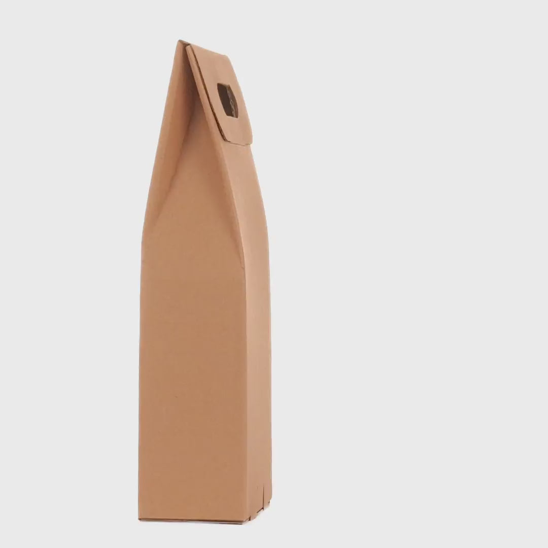 Rigid cardboard box, equipped with a front window and cut-out handle, intended for packaging and transporting bottles. The product is delivered folded and assembles quickly by hand, without the need for tools.