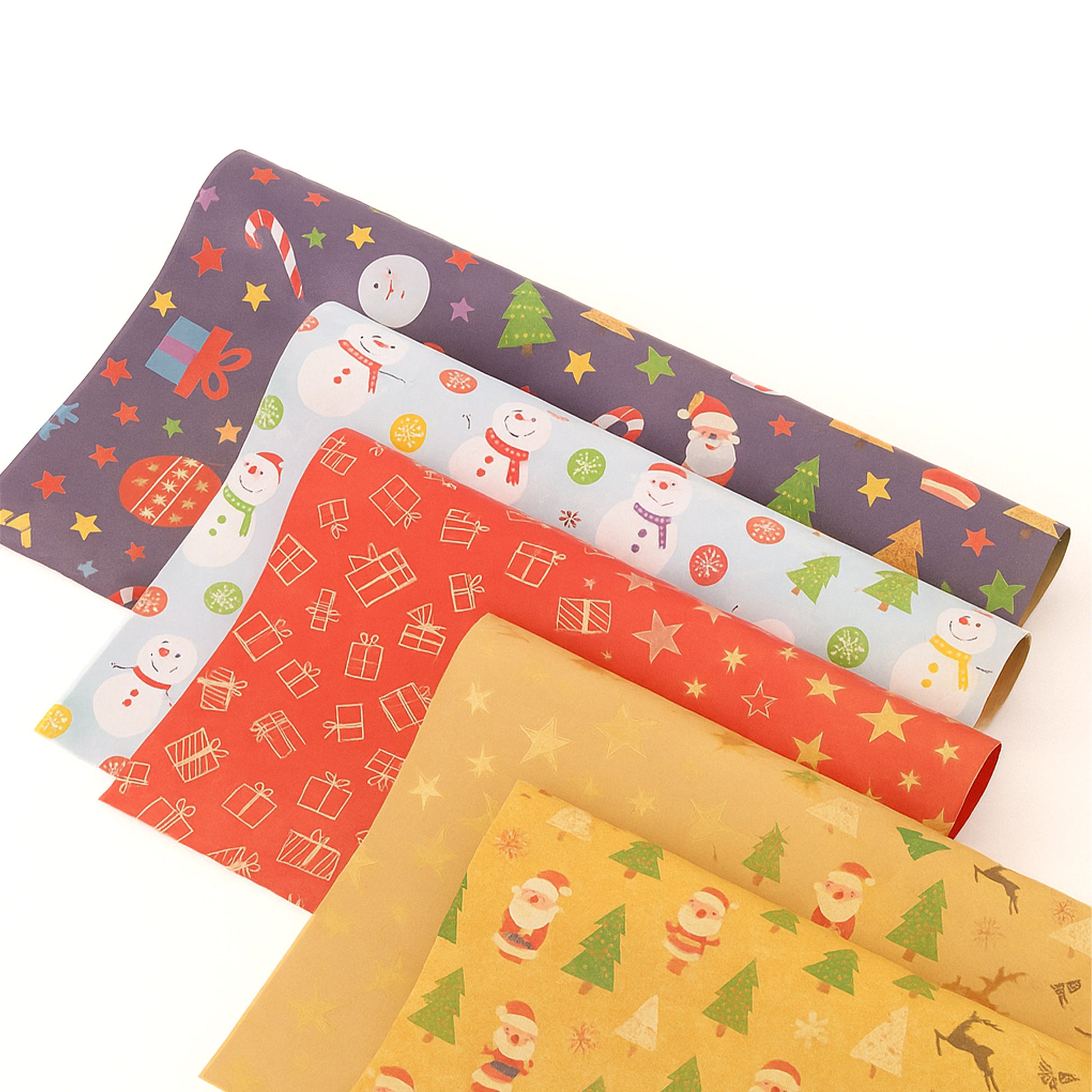 Decorative gift wrapping paper printed with classic Christmas motifs: fir trees, snowflakes, snowmen, stars, or Santa Claus. The pleasant texture and bright colors give each gift a festive look.