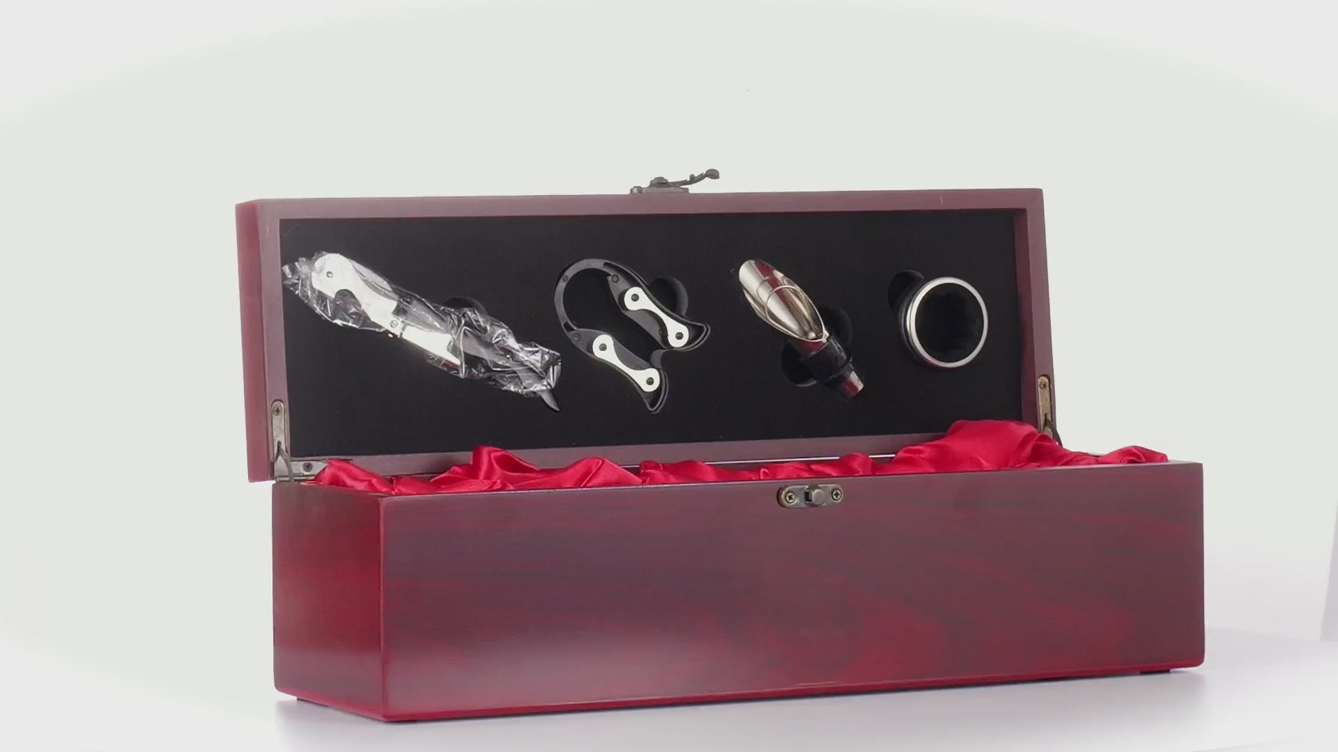 Prémium ajándékdoboz, mahagóni fa utánzatú, vöröses árnyalatú műanyagból készült. A belseje vörös szatén szövetborítással van bélelve. A doboz klasszikus borosüvegekhez kompatibilis, és tartalmaz egy teljes készlet hasznos kiegészítőt az ital felszolgálásához.