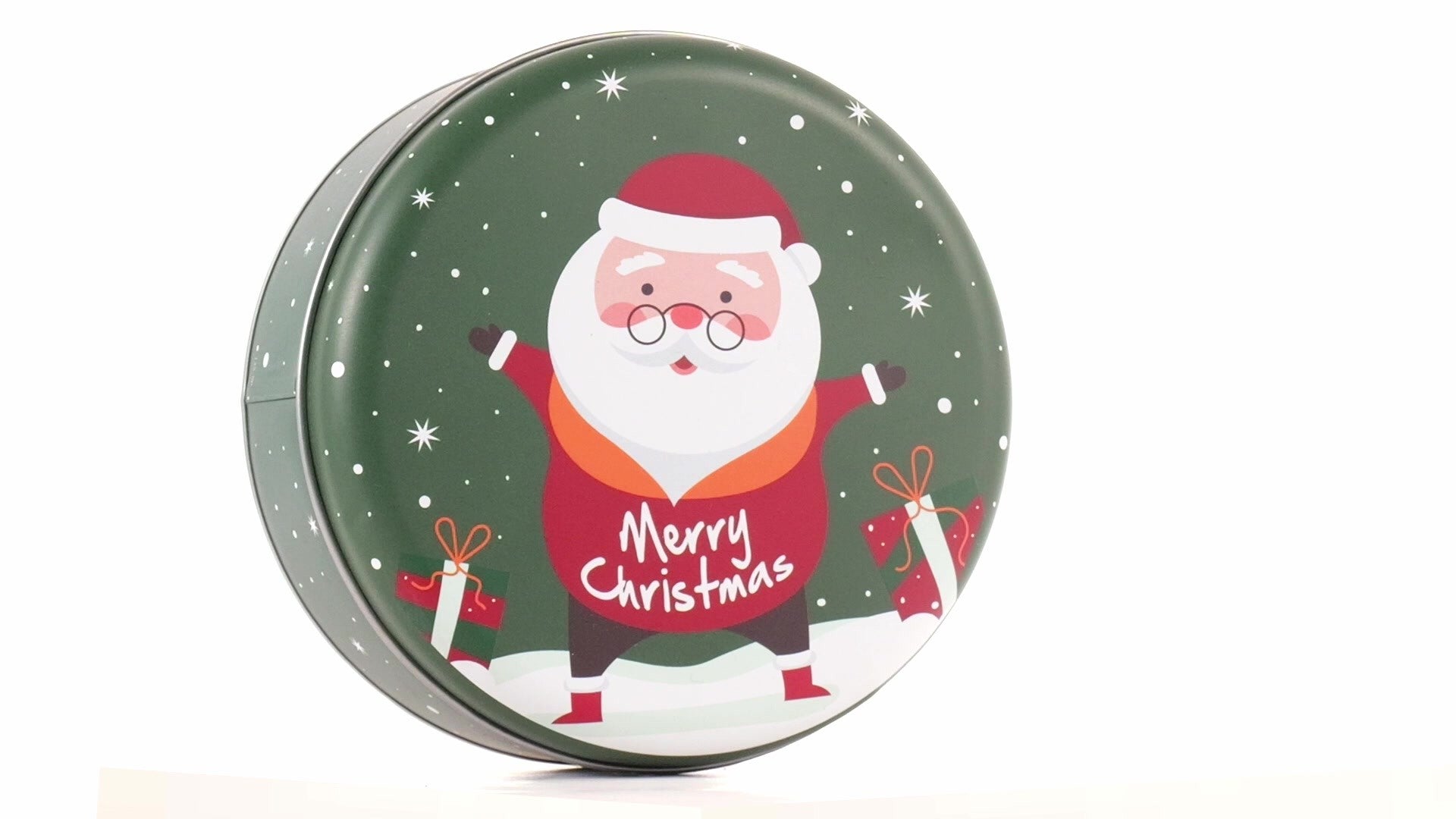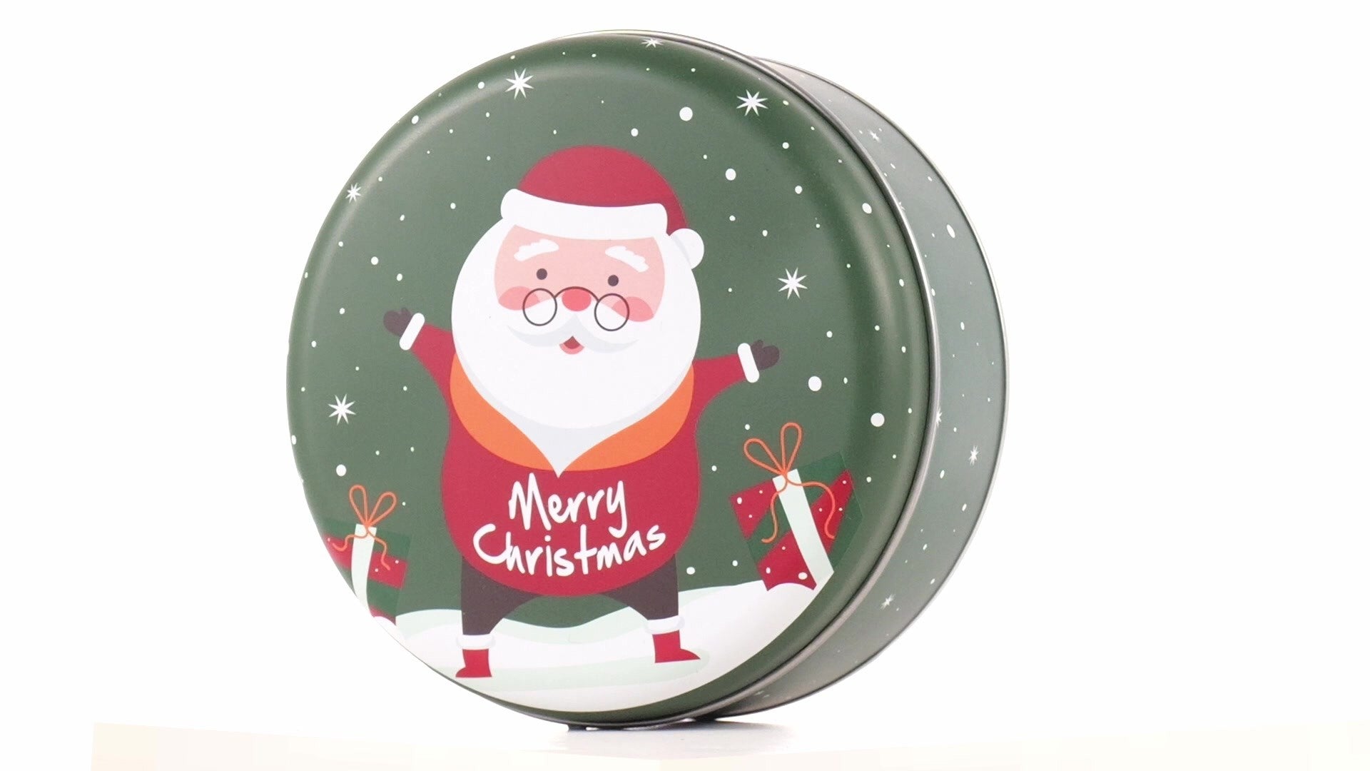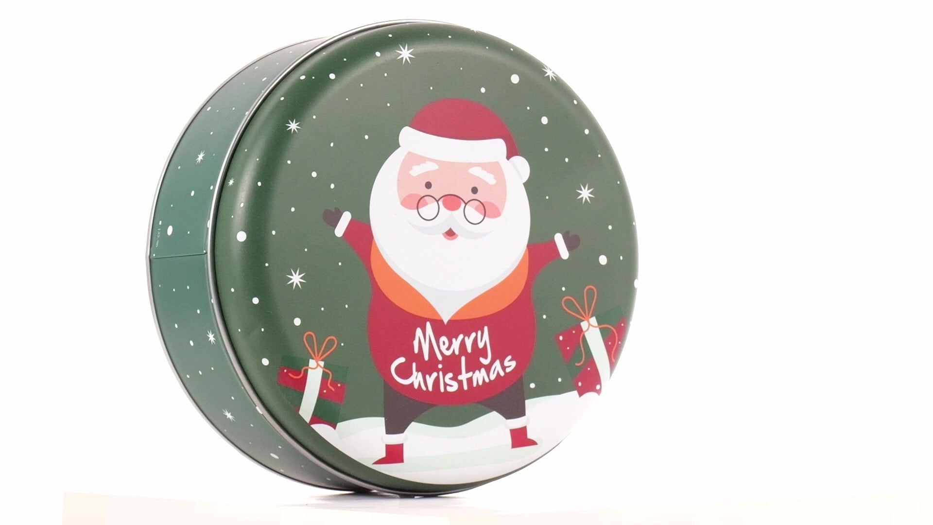 Zöld, kerek fém doboz Mikulás mintával