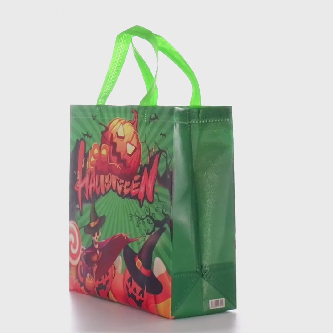 Újrahasználható Halloween tematikájú textiltáska, nem szőtt polipropilénből (non-woven), tartós és könnyű, ideális ajándékokhoz vagy a „Trick or Treat” édességgyűjtéshez. A 29 × 27 × 12 cm-es méret bőséges helyet biztosít, a 12 cm-es alj pedig stabil állást garantál, így praktikus és tartós.