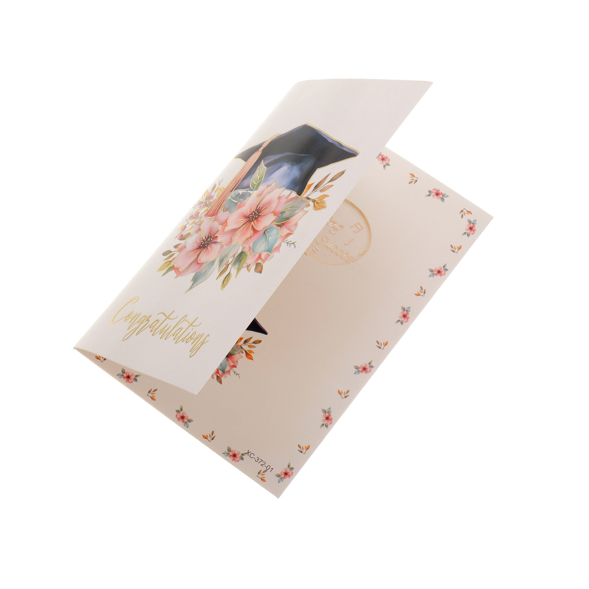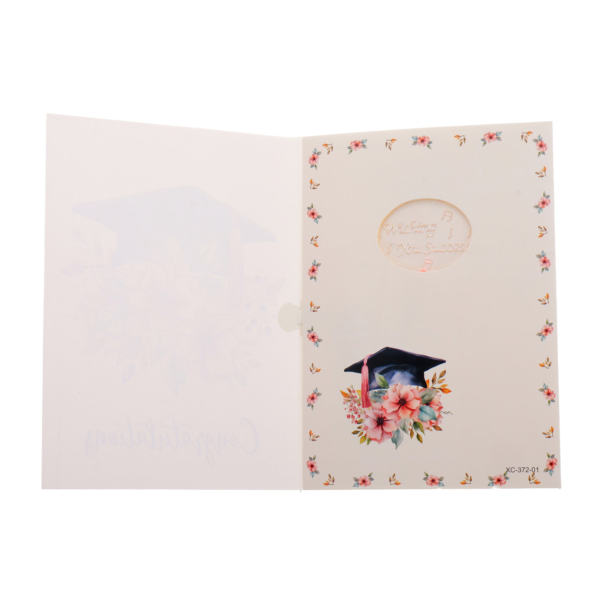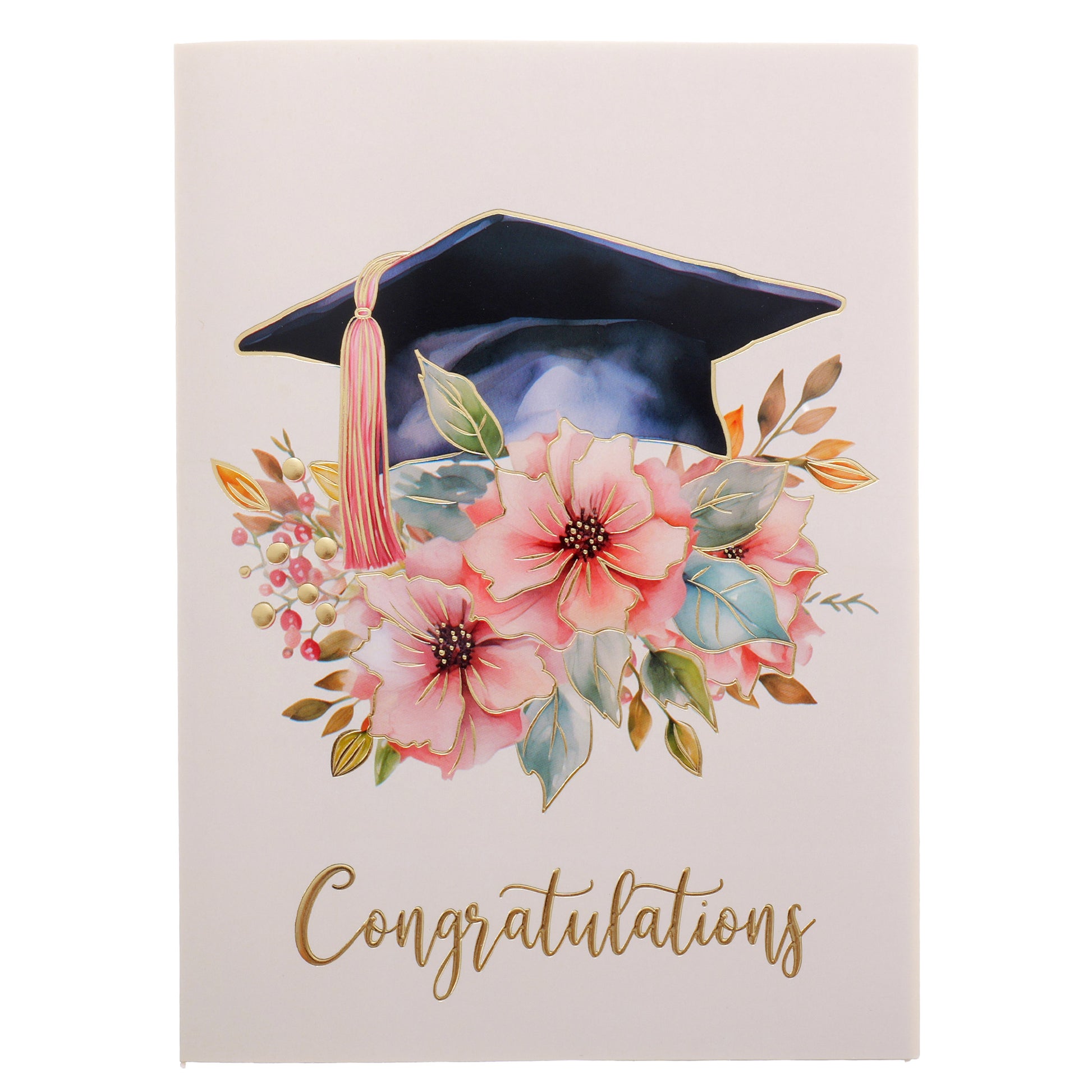 Felicitare realizată din hârtie cartonată de calitate, decorată cu o coroniță de flori și o pălărie academică — simbol al reușitei și al finalului unui capitol important. Potrivită pentru absolvirea liceului, facultății sau a unui program universitar.